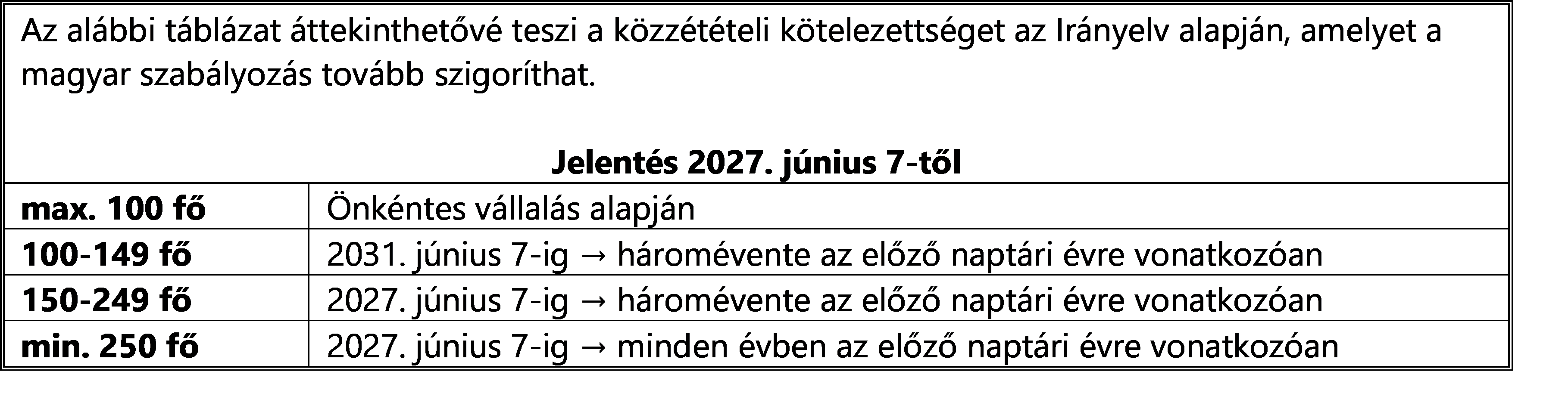 A 100-nál több, de 150 főnél kevesebb munkavállalót foglakoztatók első ízben 2031-ben készítenek kötelező jelentést, de a majdani magyar szabályozás akár előírhatja a 100 főnél kevesebb munkavállalót foglalkoztatók számára is a jelentéstételi kötelezettséget, amelyek az Irányelv szerint csak önkéntesen készítenek ilyen jelentést.